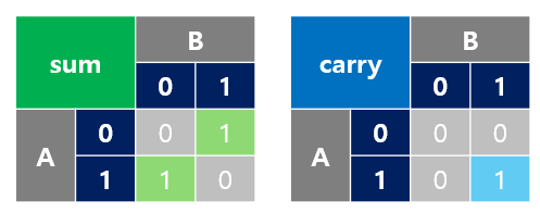 | A | B | Sum (A ⊕ B) | Carry (A ⋅ B) |