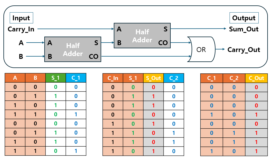 반가산기는 간단한 덧셈을 수행할 수 있지만, 기존의 자리 올림(Carry In)을 입력으로 받지 못한다는 제한이 있습니다.