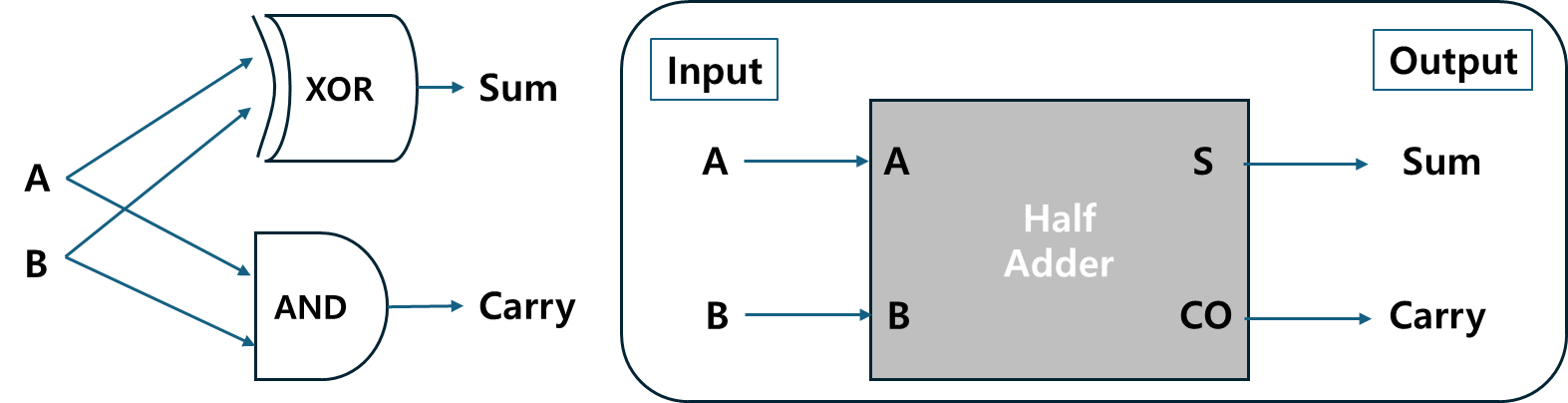 A와 B라는 두 입력을 받아 Sum과 Carry라는 두 출력을 반환합니다.XOR 게이트 사용)AND 게이트 사용)