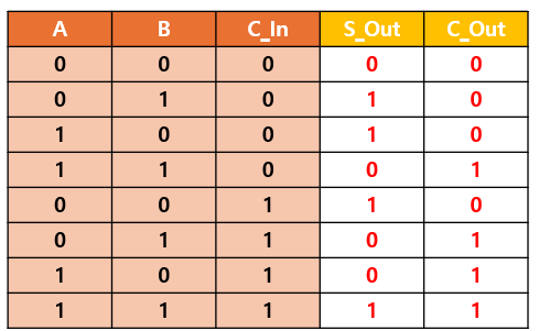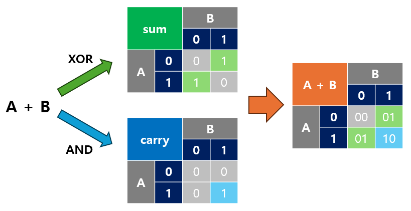 0 + 0 = 0 (Carry 없음)0 + 1 = 1 (Carry 없음)1 + 0 = 1 (Carry 없음)1 + 1 = 0, Carry = 1