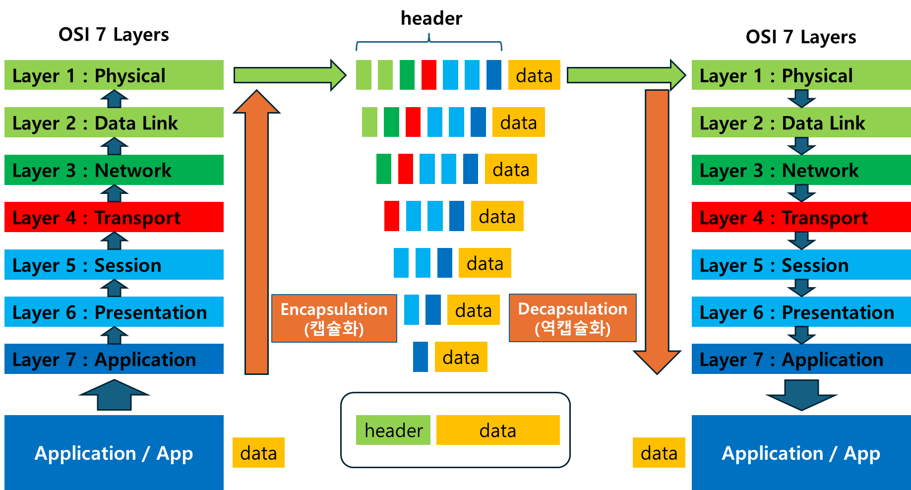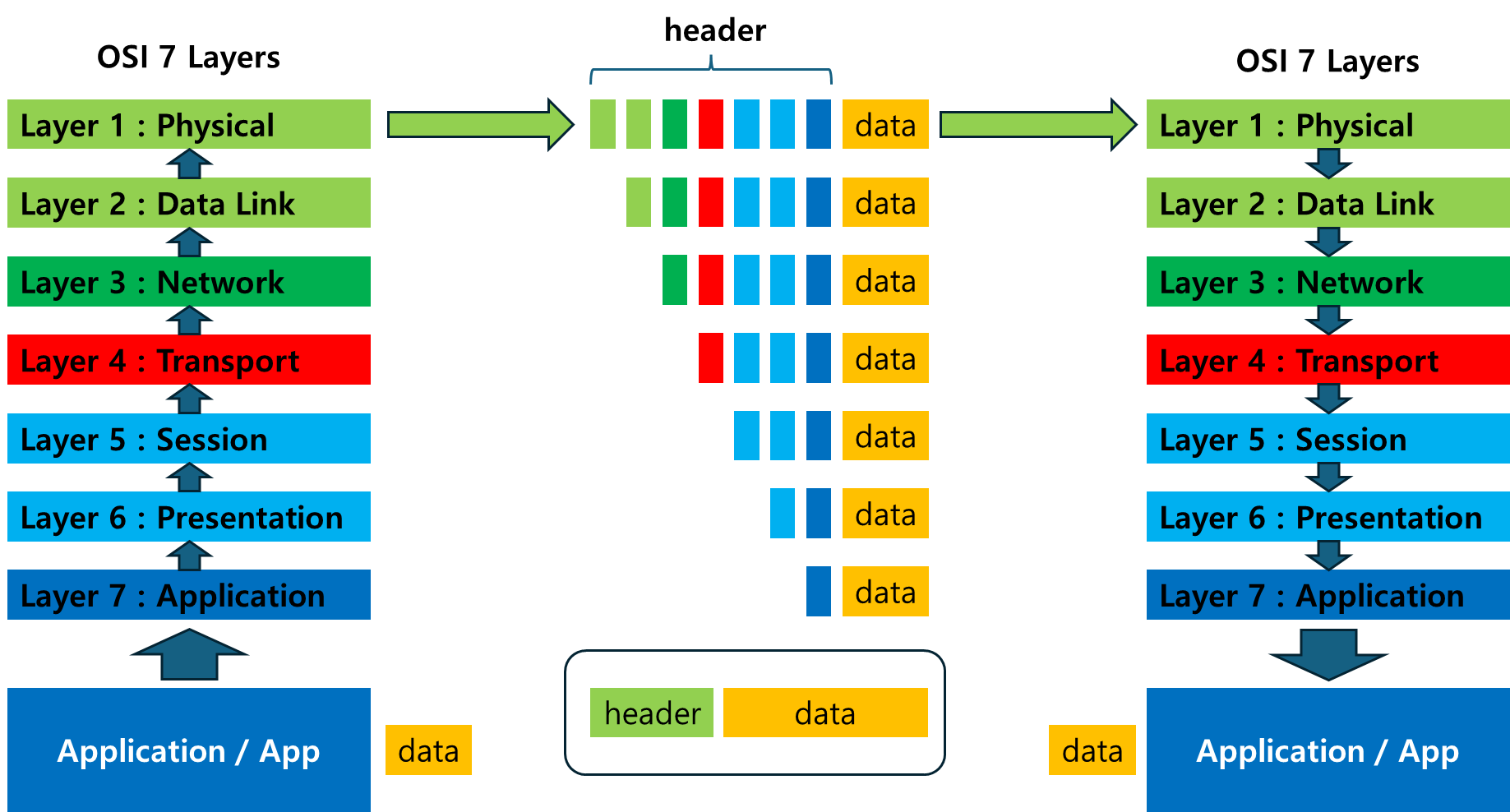 응용 계층에서 시작해 물리 계층까지 순차적으로 하강하며 처리합니다.송신 측에서 데이터가 계층별로 헤더가 추가되어 전송.물리 계층에서 데이터를 받아 응용 계층까지 상향하며 처리합니다.수신 측에서 계층별로 헤더를 제거하며 데이터를 복원.