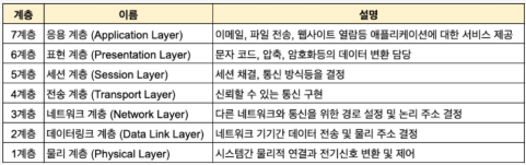 | 계층 번호 | 계층 이름 | 데이터 단위 | 주요 역할 | 예시 프로토콜/기술 |