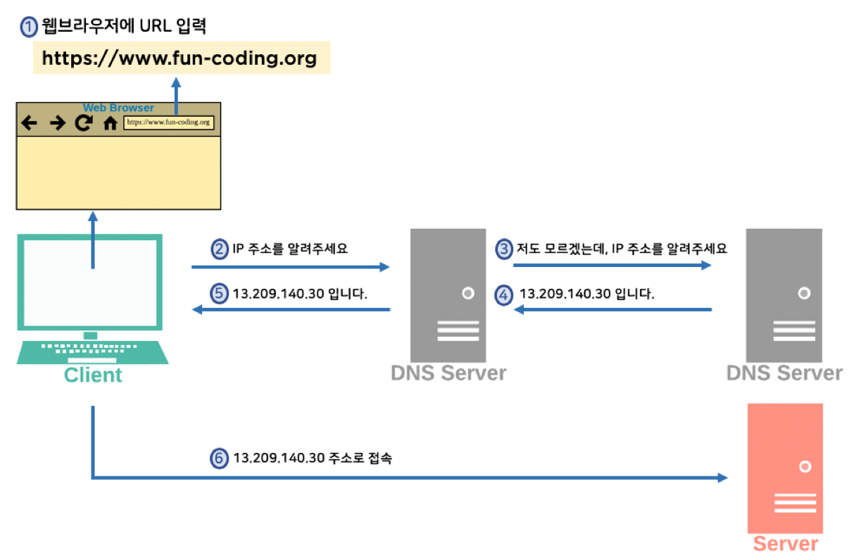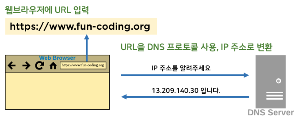 URL을 입력하면, 브라우저는 DNS 프로토콜을 사용해 URL을 IP 주소로 변환합니다.https://www.fun-coding.org13.209.140.30