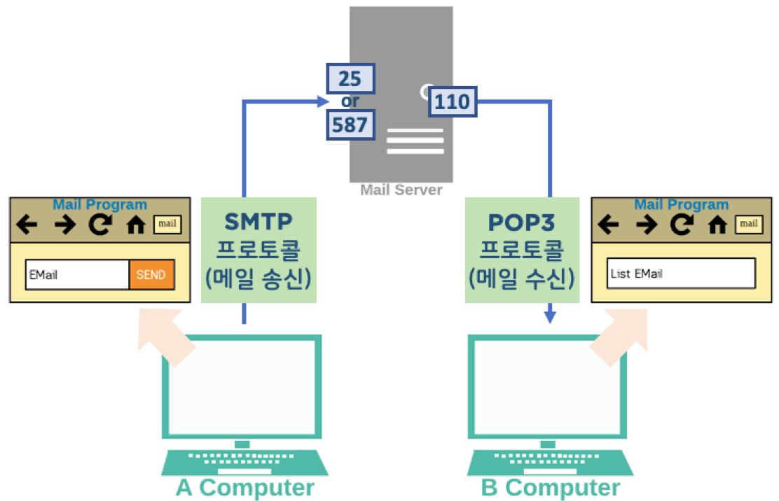 | 사용 포트 | 25, 587 | SMTP와 함께 사용 | 110 | 143 |