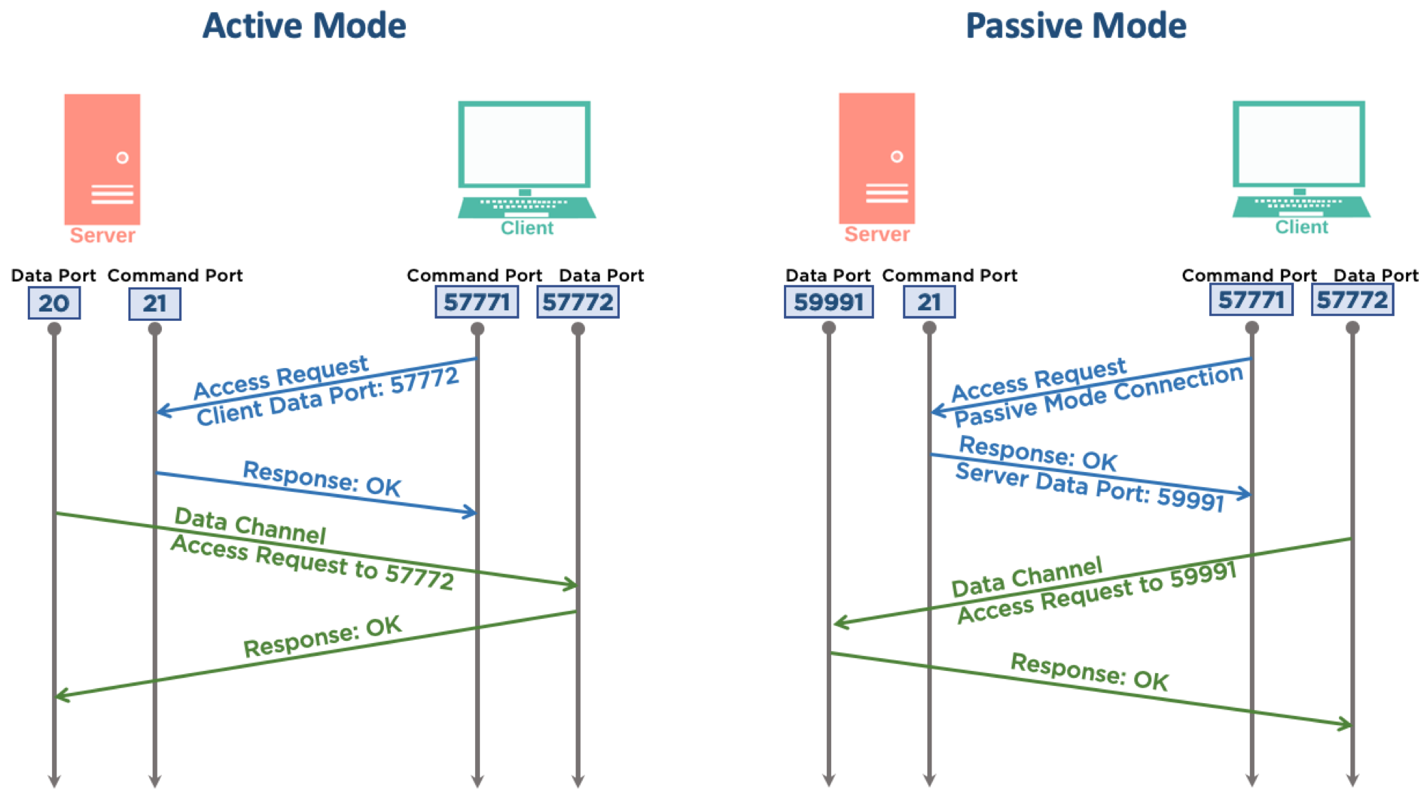 21: 연결을 설정하고 명령어를 제어.20: 파일 데이터 전송.클라이언트가 서버에 요청을 보내 파일을 전송하거나 다운로드.FTP는 Active Mode와 Passive Mode라는 두 가지 동작 모드를 제공합니다.