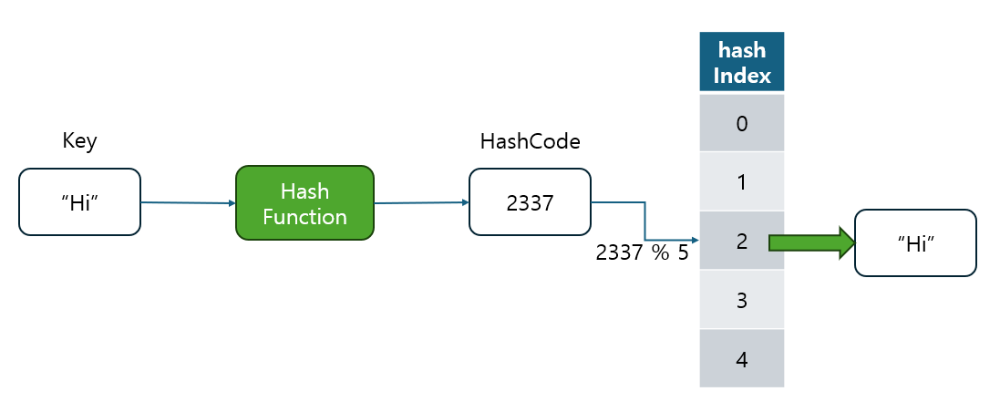 이렇게 계산 된 해시 코드는 일반적으로 테이블(혹은 배열)의 크기를 기준으로 나머지 연산을 통해 테이블 내의 특정 인덱스에 매핑됩니다.