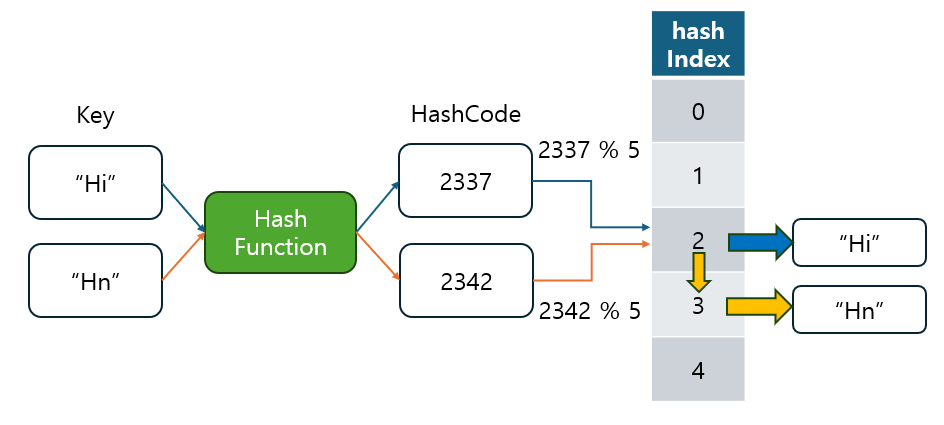 해시 함수가 서로 다른 두 개 이상의 키에 대해 동일한 해시 코드를 반환할 때를 해시 충돌(Hash Collision)이라고 합니다.