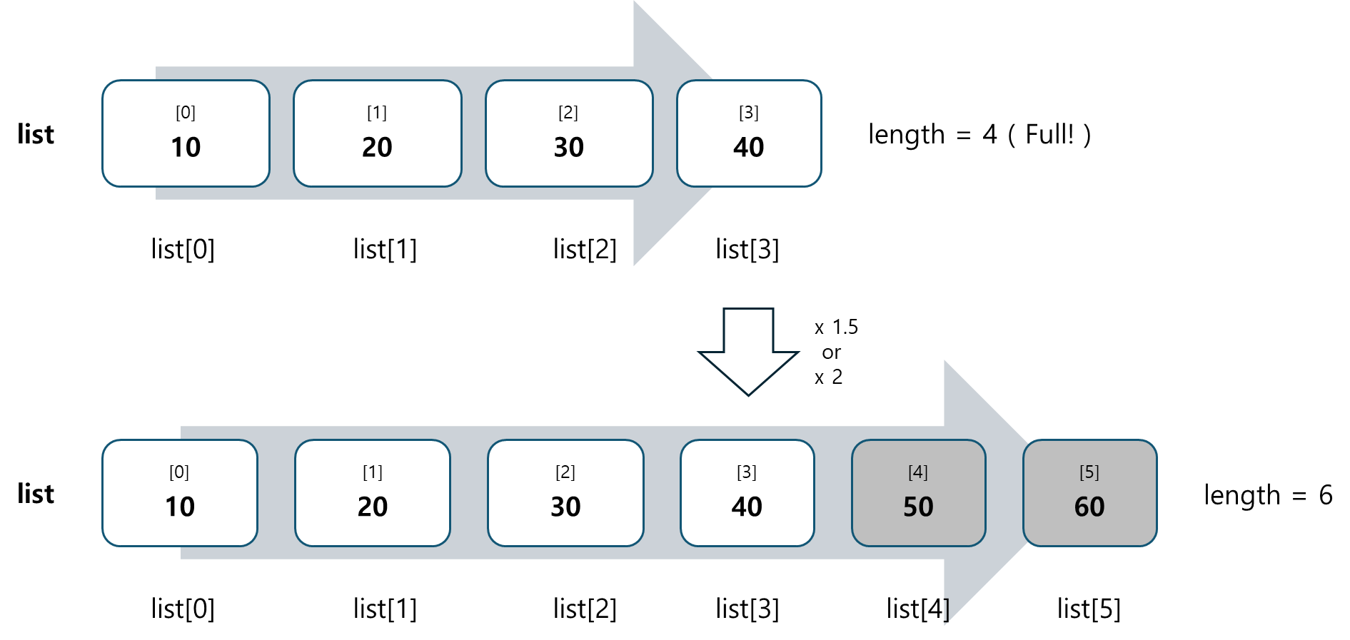 는 배열이 꽉 찼을 때 크기가 1.5배로 확장되며, Python의 List