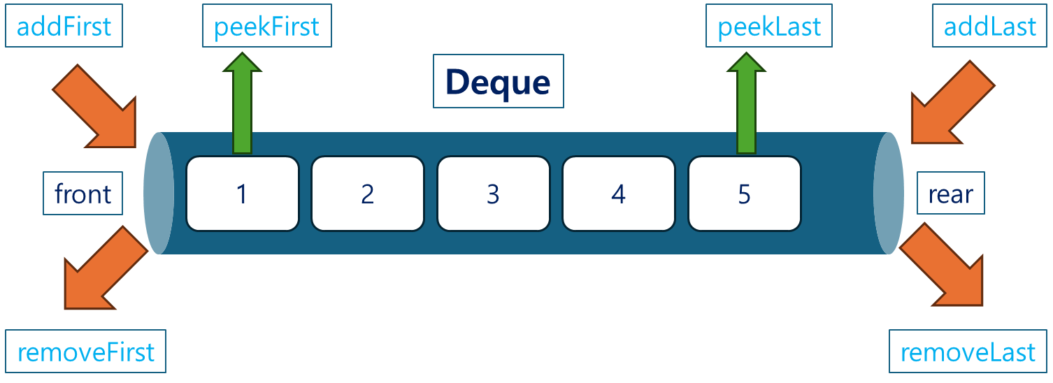 는 데이터를 앞쪽 또는 뒤쪽에 삽입할 수 있는 다양한 메서드를 제공합니다. 이 메서드들은 큐와 스택의 모든 삽입 방식들을 지원합니다.