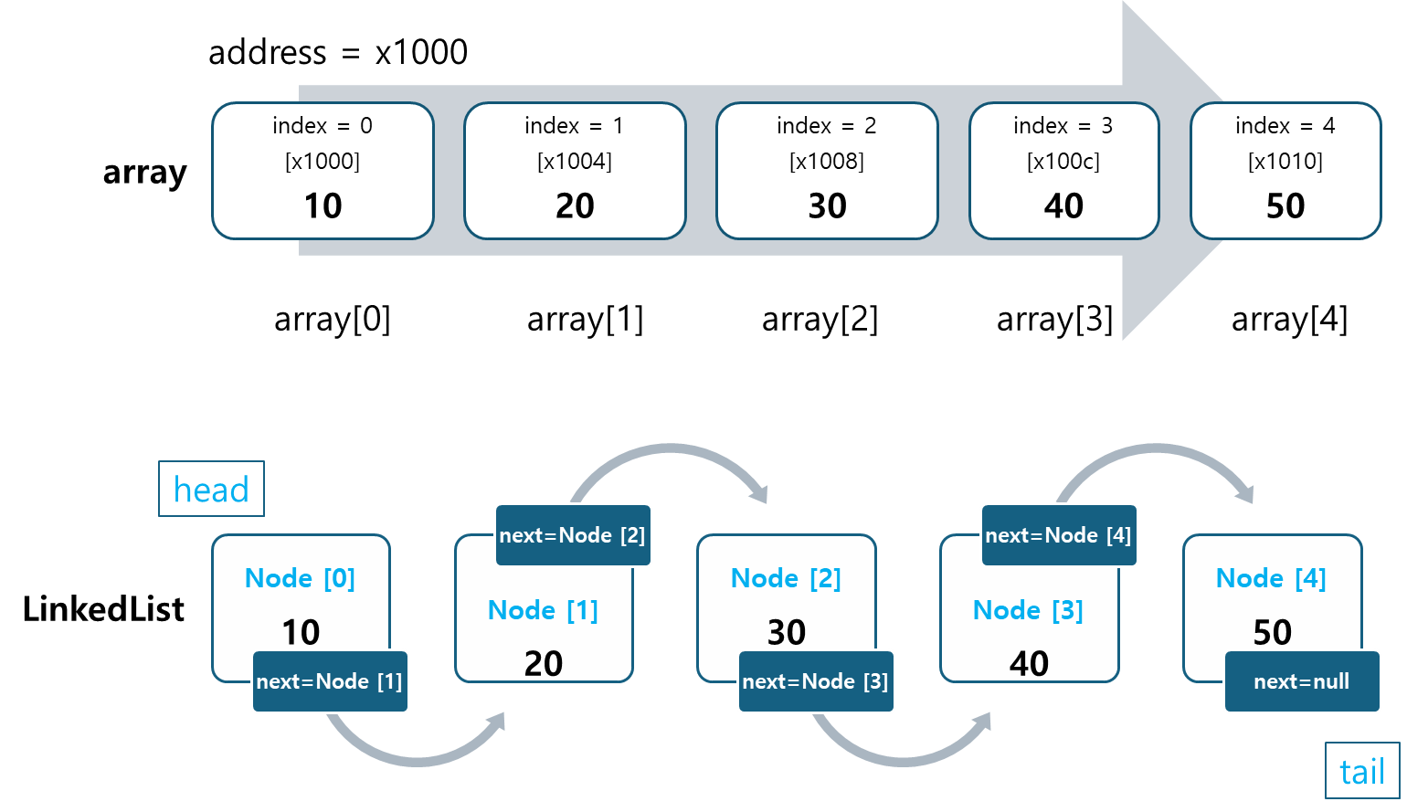 )를 유지해야 하므로, 노드 수가 많아질수록 배열에 비해 메모리 사용량이 더 커집니다.LinkedList