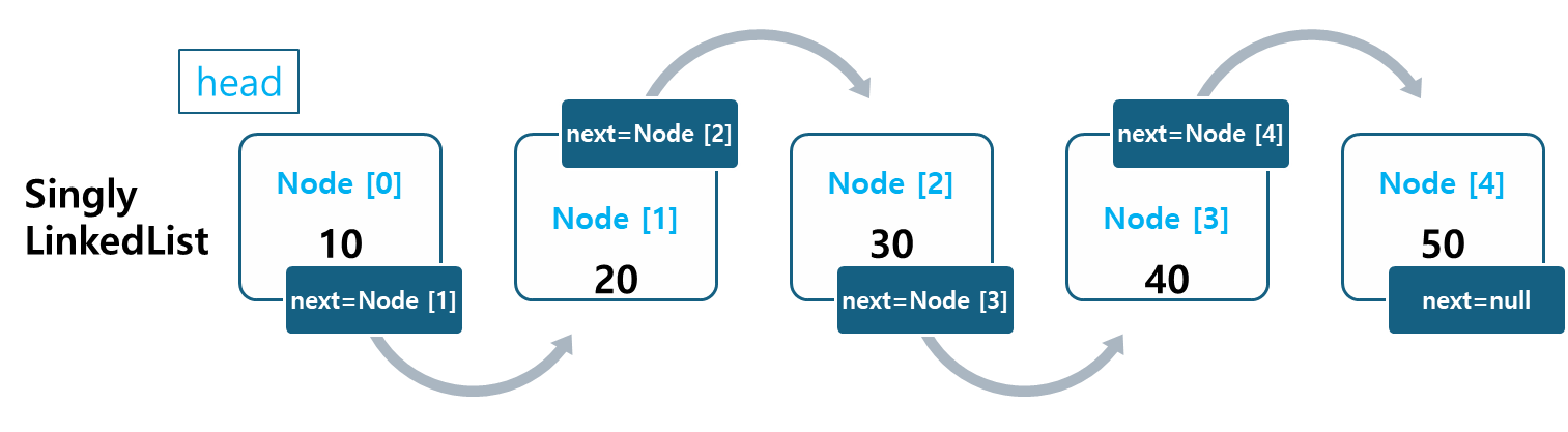 클래스는 데이터와 다음 노드를 가리키는 참조를 저장하며, SinglyLinkedList