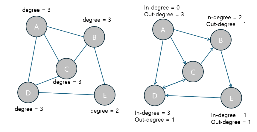 - 유향 그래프에서는 진입 차수(In-degree)와 진출 차수(Out-degree)로 구분됩니다.