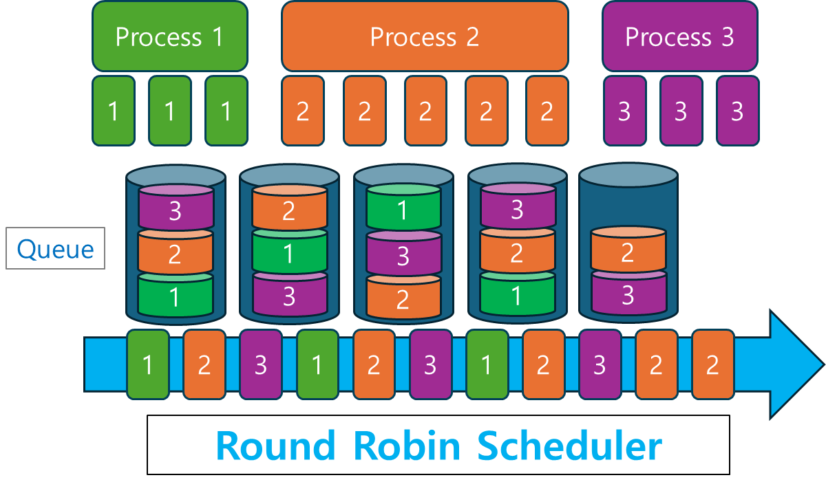 - 각 프로세스는 타임 슬라이스 동안 실행되며, 시간이 다 되면 대기열의 맨 뒤로 이동하여 다음 프로세스가 실행됩니다.