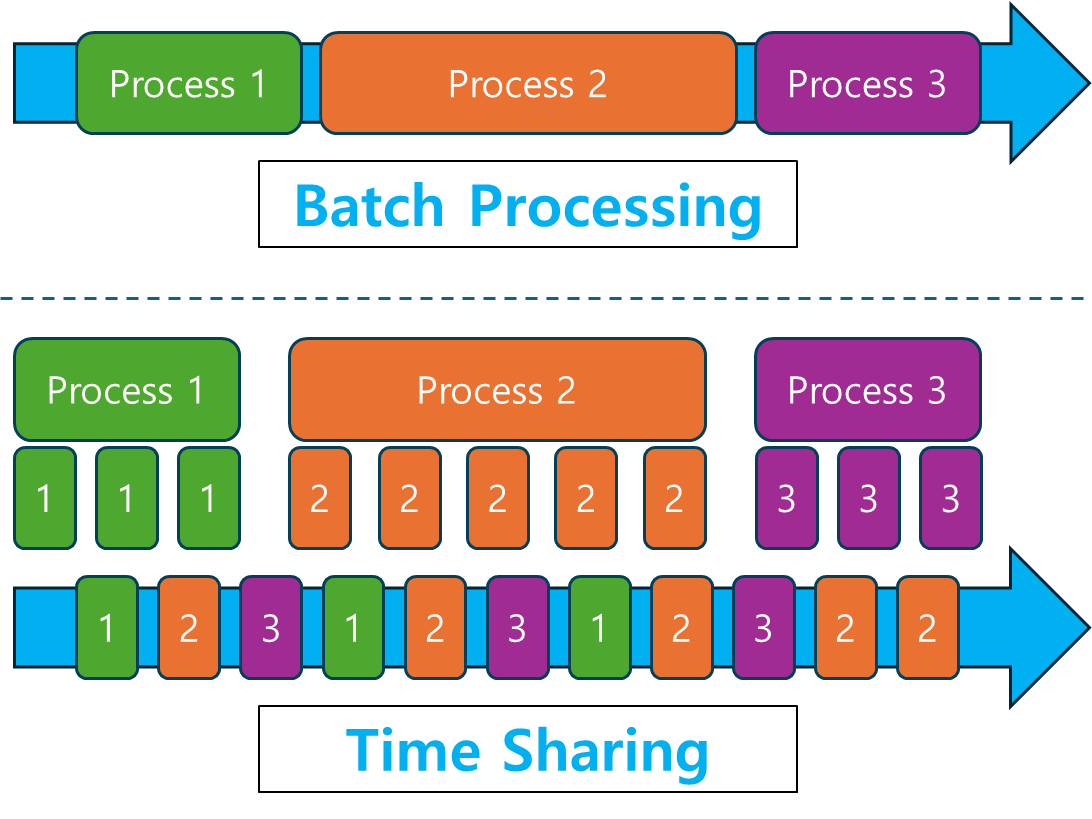 - 여러 사용자가 동시에 시스템을 사용하는 것처럼 보이도록 짧은 시간 단위로 교대로 실행하는 방식입니다.