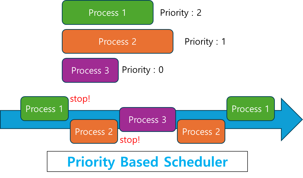 우선순위 기반 스케줄러는 각 프로세스에 우선순위를 부여하고, 우선순위가 높은 프로세스부터 실행하는 방식입니다. 응급 상황이나 긴급한 작업을 먼저 처리해야 하는 경우에 유용합니다.