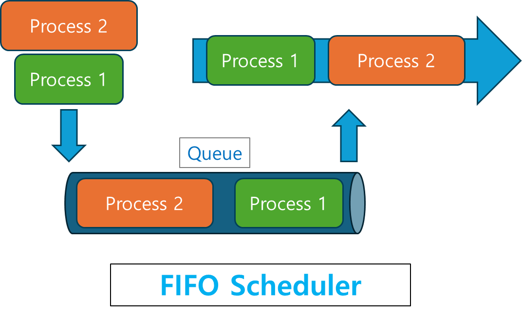 FIFO 스케줄러는 먼저 도착한 프로세스부터 차례대로 실행하는 방식입니다. 가장 단순한 스케줄링 방식으로, FCFS(First Come, First Served) 스케줄링이라고도 불립니다.
