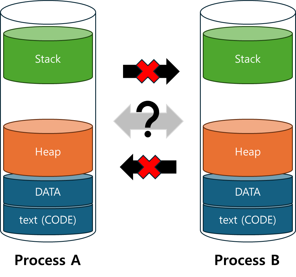 프로세스는 독립된 메모리 공간을 사용하기 때문에 다른 프로세스와 직접적인 데이터 공유가 불가능합니다.