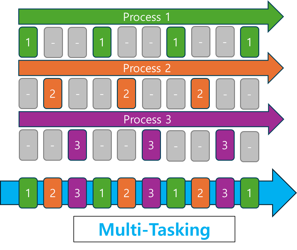 - CPU가 각 작업에 빠르게 교대로 시간을 할당하여 동시 실행되는 것처럼 보이게 합니다.