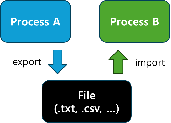 - 각 프로세스가 파일에 데이터를 저장하고, 다른 프로세스가 이를 읽는 방식입니다.