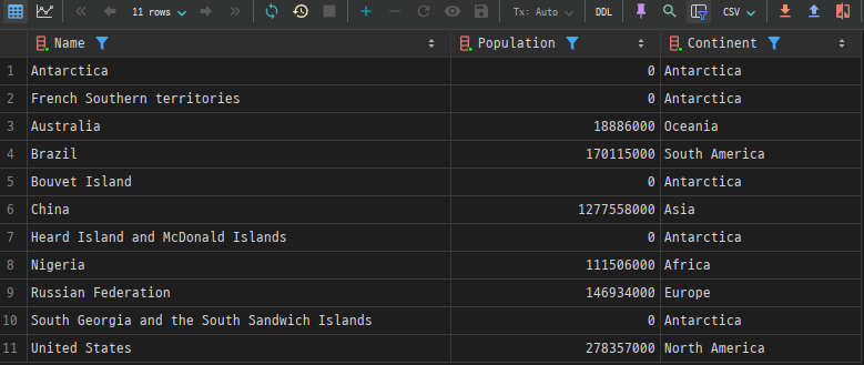 예제: 각 대륙별로 인구가 가장 많은 국가와 그 인구 수를 조회