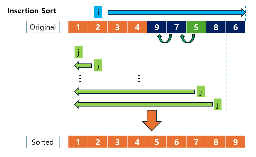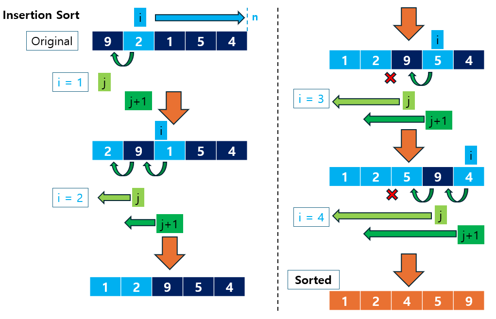 Insertion Sort는 다음과 같은 순서로 동작합니다: