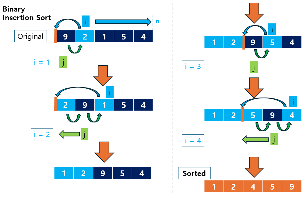 Binary Insertion Sort는 다음과 같은 순서로 동작합니다: