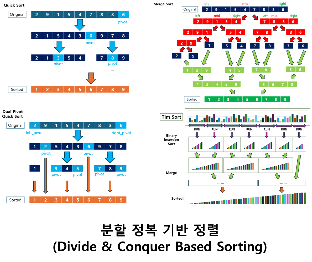 분할 정복 기반 정렬 알고리즘들은 문제를 작은 단위로 분할한 후 각각을 정렬하고 다시 합쳐 전체 문제를 해결하는 방식입니다.