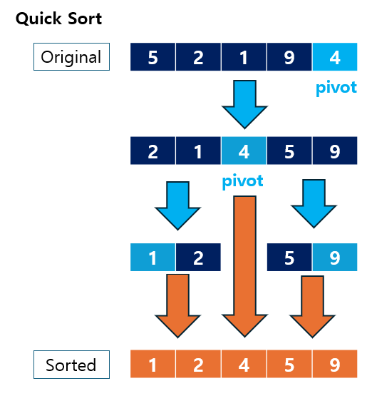 를 기준으로 작은 값은 왼쪽, 큰 값은 오른쪽으로 나누면 [2, 1] | 4 | [5, 9]가 됩니다.1
