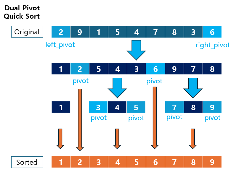 Dual-Pivot Quick Sort는 퀵 정렬(Quick Sort)의 변형된 알고리즘으로, 두 개의 피벗을 사용하여 배열을 세 부분으로 나누어 정렬하는 방식입니다.