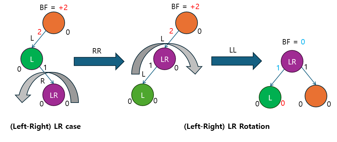 LR 회전 | BF ≥ +2 | 왼쪽 자식의 BF < 0 | 왼쪽 자식이 오른쪽으로 치우친 경우. 먼저 RR 회전 후, LL 회전. |