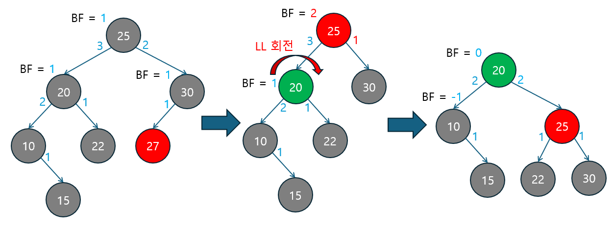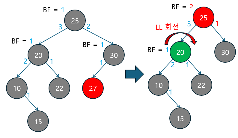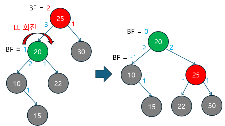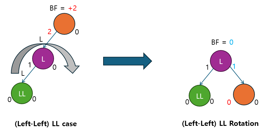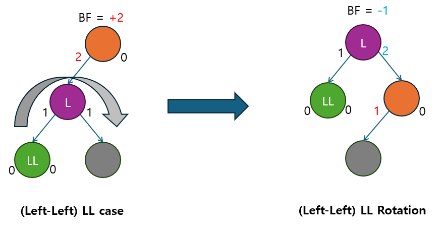 LL 회전 | BF ≥ +2 | 왼쪽 자식의 BF ≥ 0 | 왼쪽 자식이 다시 왼쪽으로 치우친 경우. 단순 LL 회전으로 해결. |