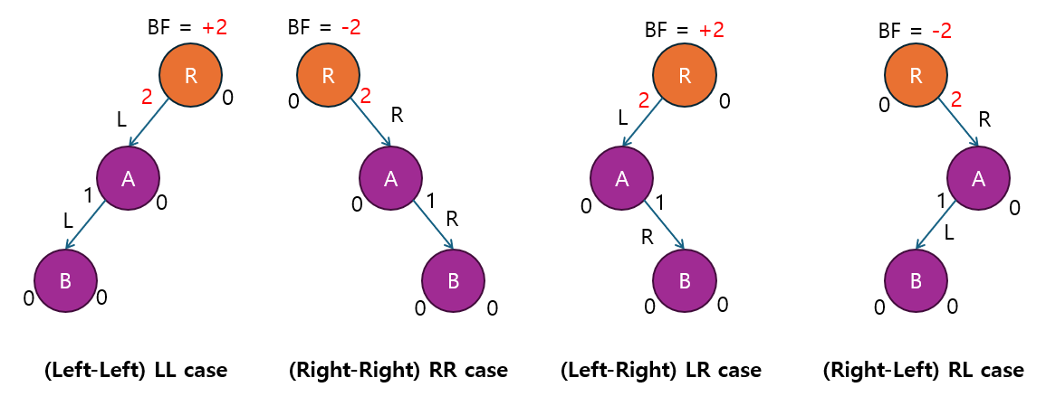 트리의 균형이 깨질 때는 네 가지 케이스가 발생합니다: