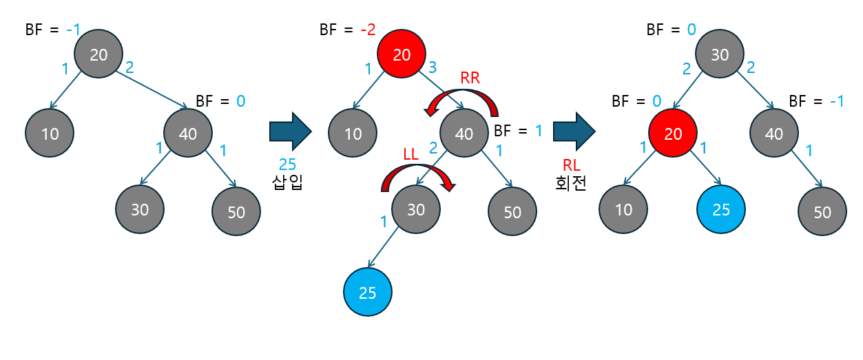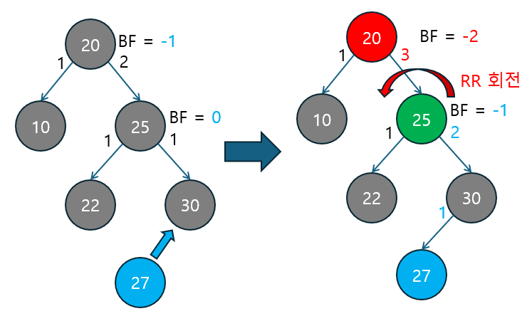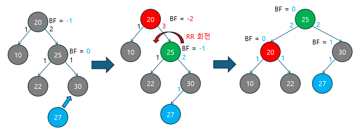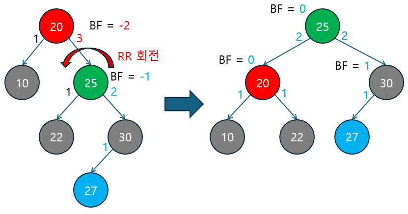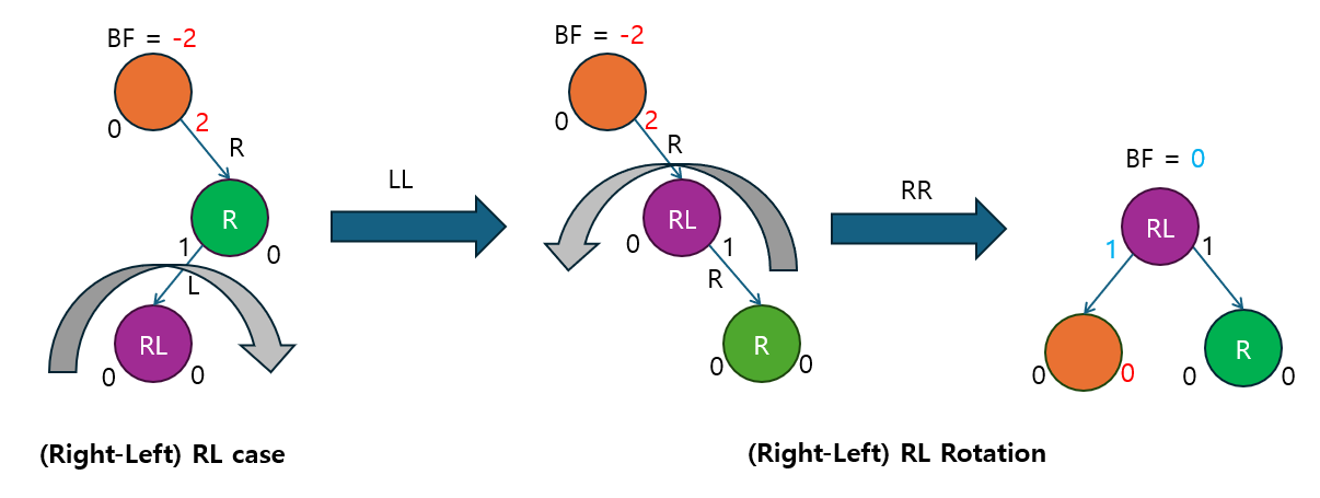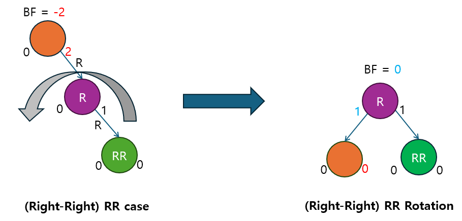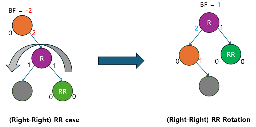 RR 회전 | BF ≤ -2 | 오른쪽 자식의 BF ≤ 0 | 오른쪽 자식이 다시 오른쪽으로 치우친 경우. 단순 RR 회전으로 해결. |