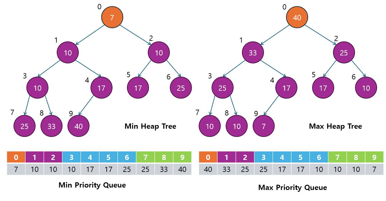 Heap(힙)을 이용한 구현: 가장 일반적인 방식으로, Min Heap 또는 Max Heap을 사용하여 삽입과 삭제를 O(log n) 시간에 처리합니다.