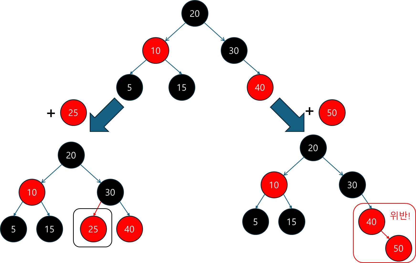 은 내부적으로 Red-Black Tree의 삽입 규칙에 따라 색상 변경과 회전 연산을 통해 트리의 균형을 유지합니다.