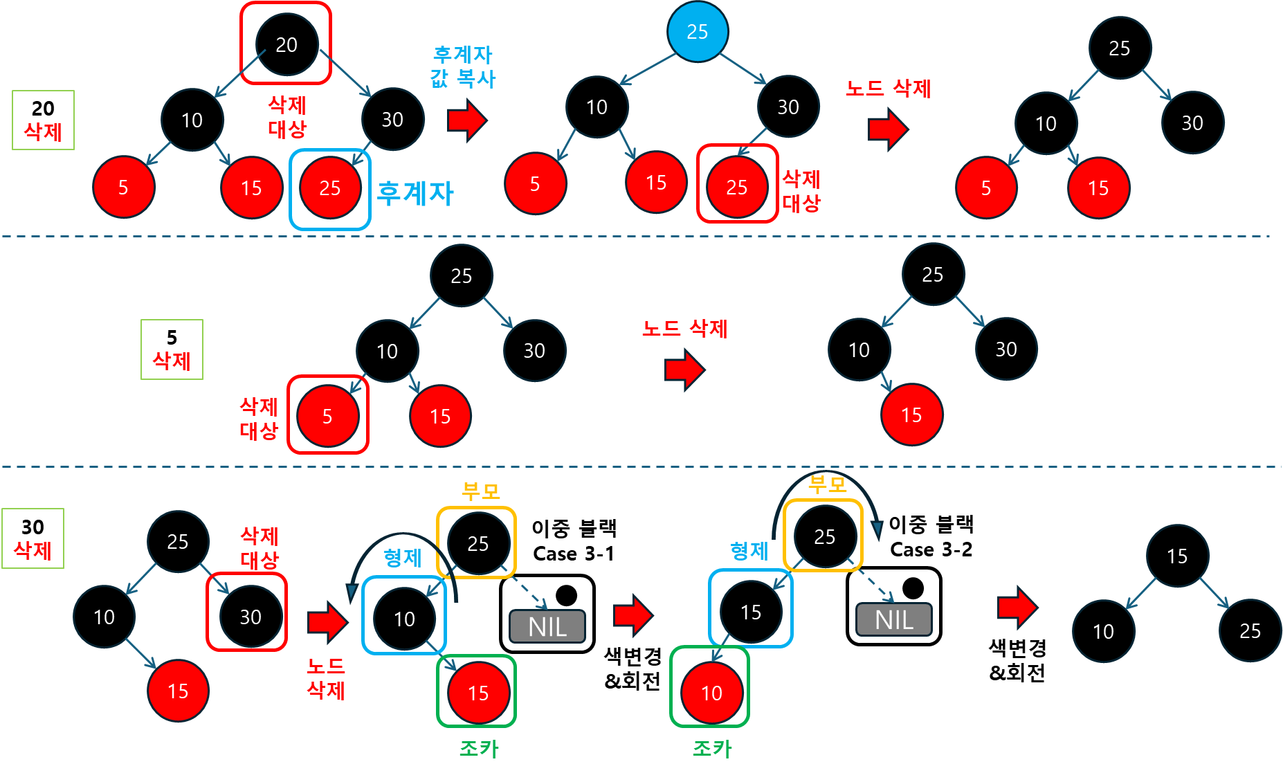 ): 키에 대응하는 값을 삭제할 때에도 Red-Black Tree의 삭제 규칙이 적용됩니다. 노드가 삭제된 후 발생하는 이중 블랙 문제를 해결하기 위해 색상 변경과 회전이 이루어집니다.