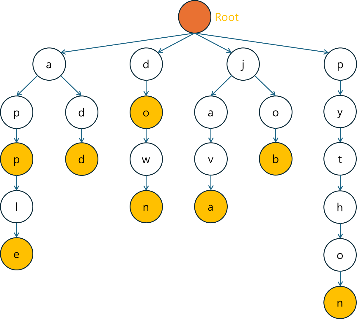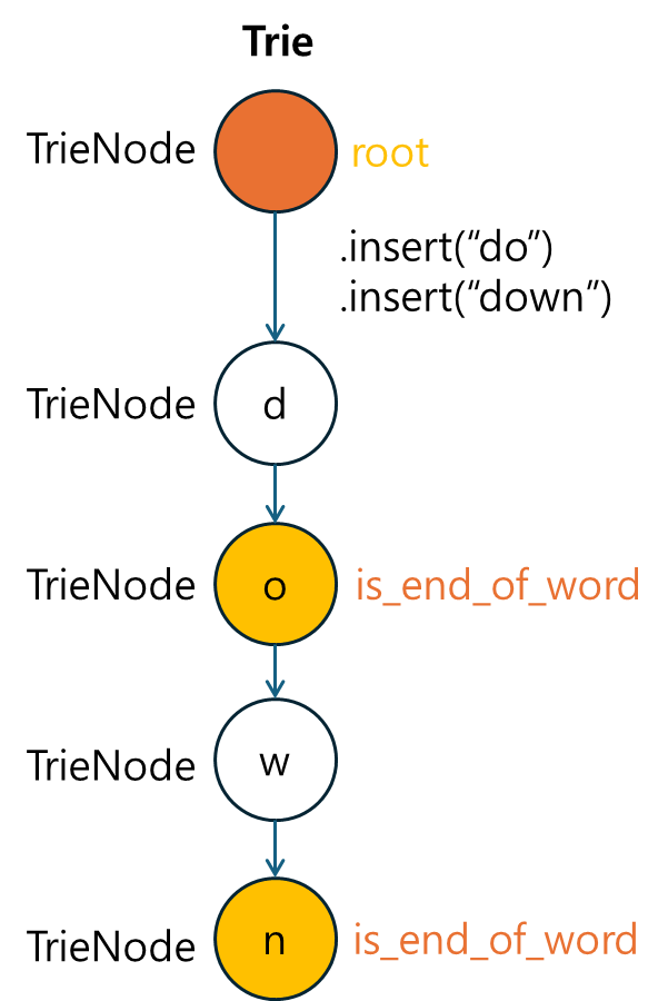 root: Trie는 항상 루트에서 시작되며, 루트 노드는 공백 노드로 정의됩니다.다음으로, 문자열을 Trie에 삽입하는 insert 메소드를 구현합니다. 문자열의 각 문자를 순차적으로 탐색하며, 노드가 존재하지 않으면 새 노드를 추가합니다.