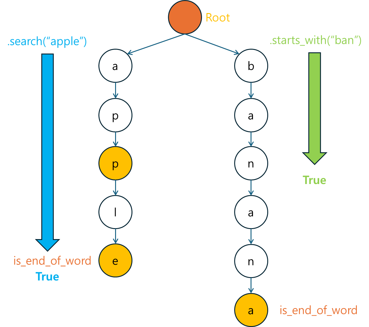 False를 반환합니다.is_end_of_word가 True여야만 단어가 존재하는 것입니다.접두사(Prefix)로 시작하는 단어가 존재하는지 확인하기 위해 starts_with 메소드를 구현합니다.