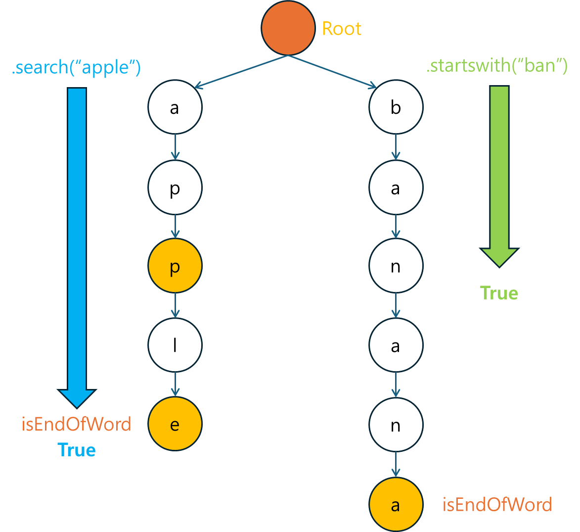 false를 반환합니다.isEndOfWord가 true여야만 단어가 존재하는 것입니다.접두사(Prefix)로 시작하는 단어가 존재하는지 확인하기 위해 startsWith 메소드를 구현합니다.