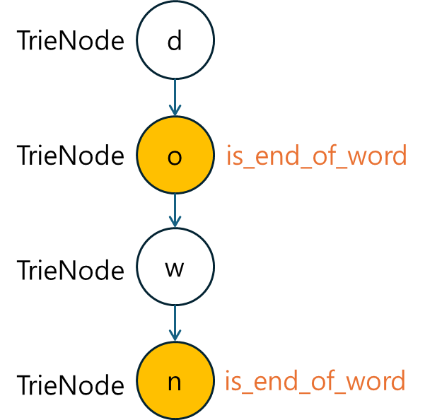 Trie 자료구조에서 각 노드는 하나의 문자를 나타내며, 자식 노드와 단어의 끝을 표시하는 플래그가 필요합니다. 이를 위해 TrieNode 클래스를 정의합니다.