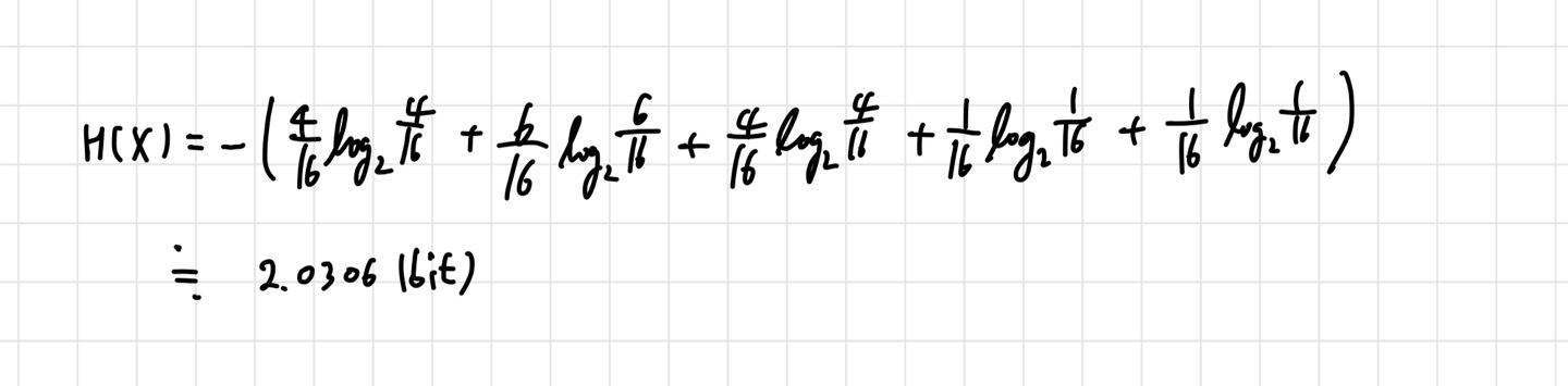 여기서도 보통 a=2를 많이 사용한다. 엔트로피는 로 표현하며, 는 확률 랜덤 변수를 의미한다. 정보량의 평균이라고 정의했기 때문에 위와 같은 식이 나온 것이다. 이것도 예시를 통해 알아보자. 윷놀이의 엔트로피를 구해보겠다. 여기서 나올 수 있는 경우의 수는 {도, 개, 걸, 윷, 모} 이다. 각각의 확률을 구해 식에 대입하면 된다.
