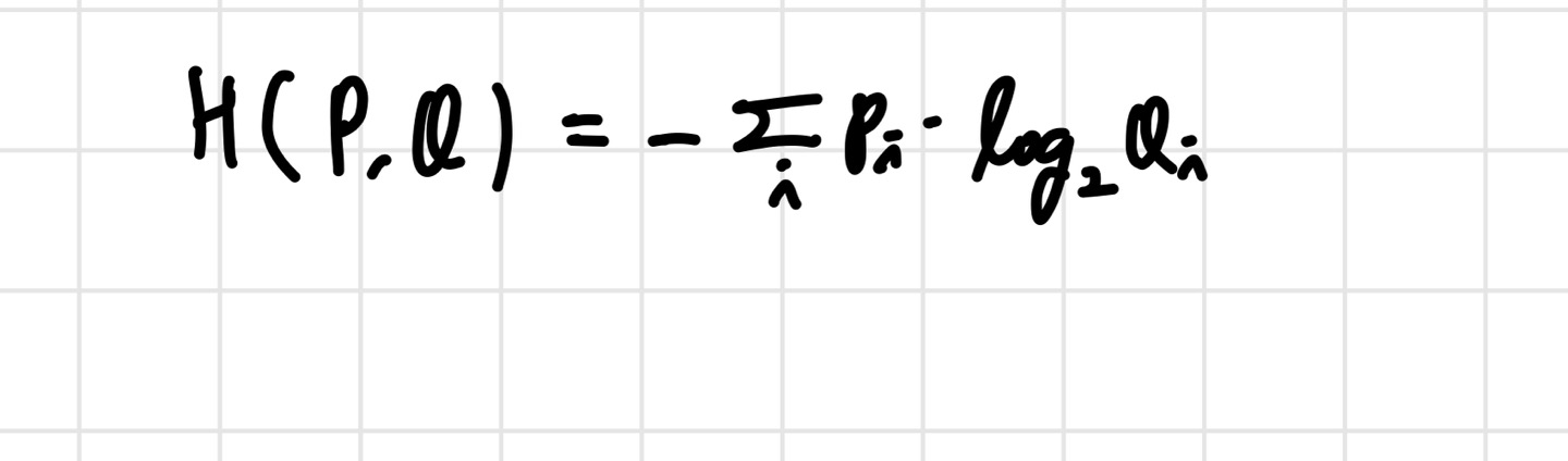 지금까지는 하나의 확률분포 에 대해서만 살펴봤다면, 이제는 확률 분포 도 등장한다. 는 이상적인 확률 분포, 는 우리가 모델링해서 얻은 확률분포이다. Cross Entropy는 와 를 비교했을 때, 즉 이상적인 값(정답 값)과 예측값이 달라서 생기는 정보량인 것이다.