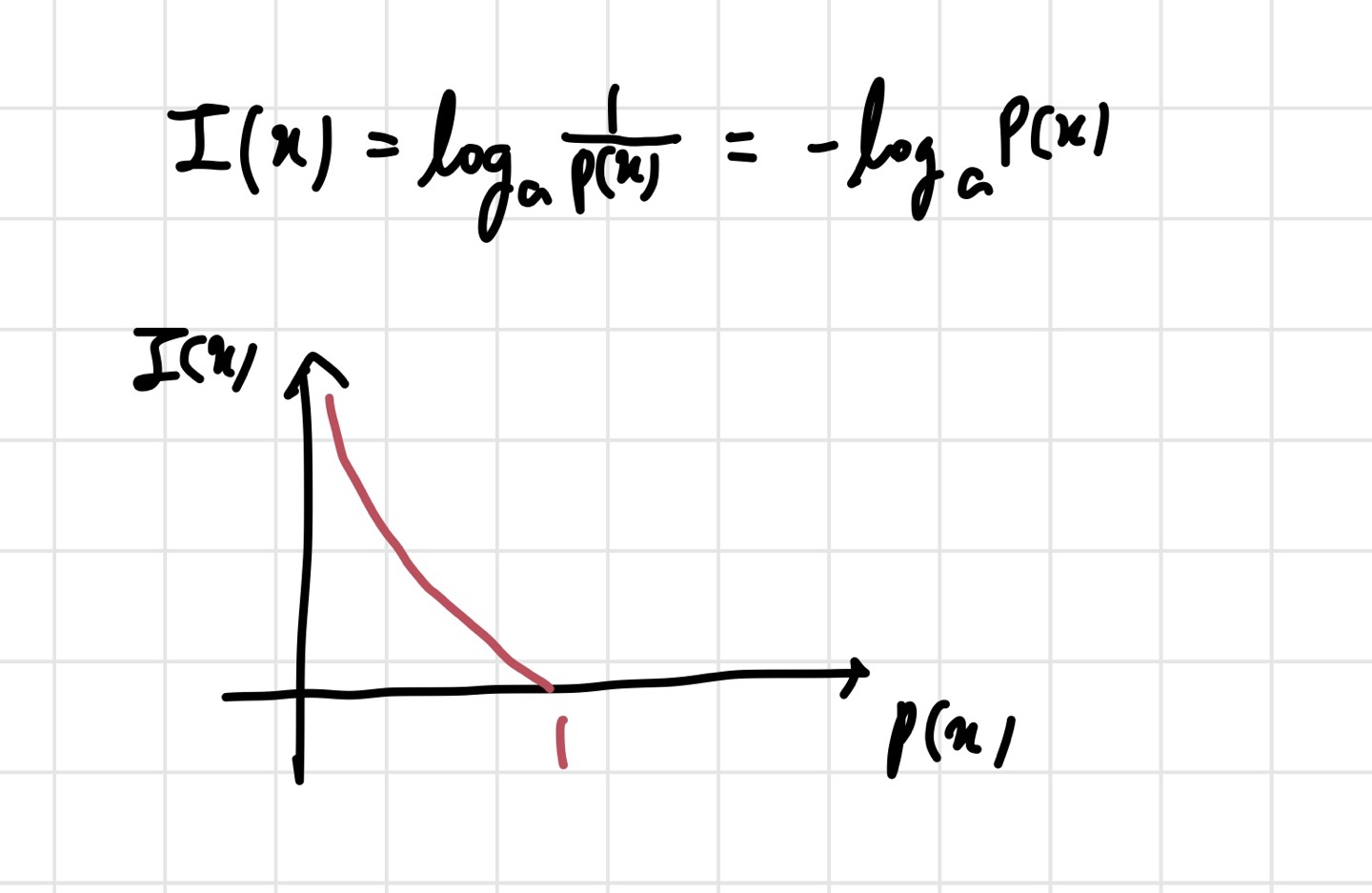 보통 bit를 구해야 하기 때문에 a값은 2를 많이 쓴다. 여기서 는 어떤 사건을 의미하고, 는 사건 가 일어날 확률을 의미한다. 안에 가 아니라 이 들어간 이유는 위 사진의 그래프를 통해 이해할 수 있다. 기본적인 컨셉은 발생확률이 큰 것은 적은 bit수로 표현하는 것이었다. 를 사용해 이게 가능해진 것이다. 그래프를 보면 가 커질수록 정보량은 줄어든다. 우리가 원하는 바를 이룬 것이다. 다시 한 번 정리하자면, 확률이 적은 사건(잘 일어나지 않는 사건)이 일어났을 때 많이 놀란다는 것(정보량이 많다는 뜻)이다. 이를 바탕으로 entropy를 살펴보자.