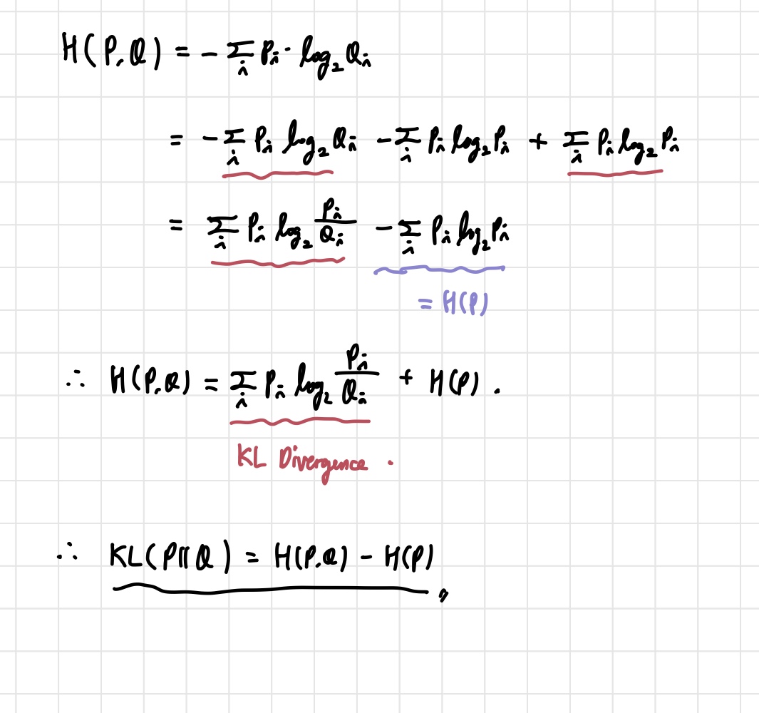 KL Divergence는 두 분포가 얼마나 비슷한가에 대한 답을 주는 개념이다. 어려운 말로 하면 이상적 분포 에 대해 그 분포를 근사하는 다른 분포 (우리가 모델을 통해 얻은 분포)를 샘플링 한다면 얻을 수 있는 정보량의 차이라고 표현할 수 있다. 그런데 나한테 더 와닿았던 것은 '두 분포가 얼마나 비슷한가' 라는 표현이다. KL Divergence 식은 cross entropy로부터 유도할 수 있다.