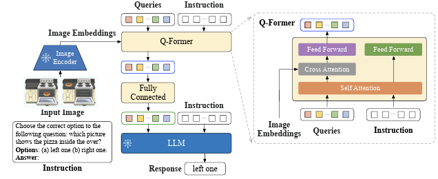 위의 사진에서 우측의 Q-Former 내부 구조를 보면, Learnable Query와 Instruction이 Self-Attention Layer를 통과하며 instruction에 condition된 output query를 얻게 된다. 이 query가 cross-attention layer를 통과하며 query가 자신이 집중해야 부분이 어디인지에 대한 정보를 학습하게 된다.