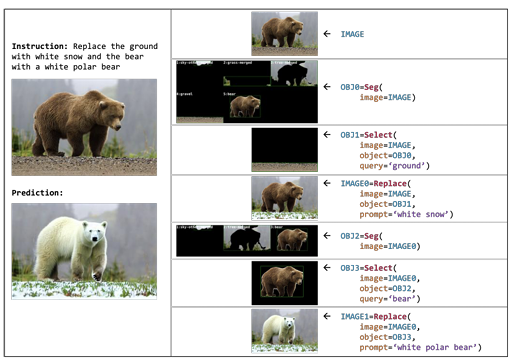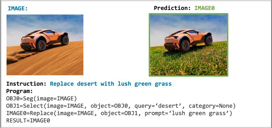 Visual Programming은 제공된 이미지를 텍스트에 맞게 바꾸려면 어떻게 분해하고 재합성하면 좋을 지에 대한 절차를 계획하고, 이를 프로그래밍하는 방법론을 제안했다.