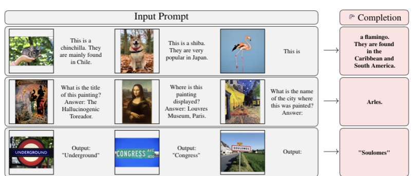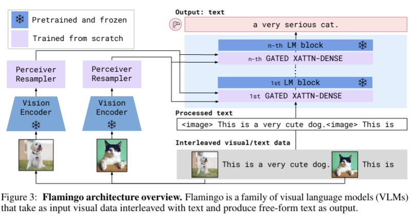 다음은 transformer 이후에 나온 Flamingo라는 VLM이다. 모델에게 우리가 수행하고 싶은 task에 대한 few-shot (image, text) pair를 주고, 우리가 output을 얻기를 원하는 text를 주면, 모델이 답을 해주는 형식이다. 논문의 저자들은 아래와 같은 예시를 보여준다. 사진을 보면 Input Prompt에 3개의 열이 있는데, 왼쪽 2개의 열이 few-shot example이다. 이를 모델에게 알려주고 왼쪽에서 3번째 열에 이미지와 약간의 text를 제공하면, 모델이 text를 완성해주는 형식인 것이다.