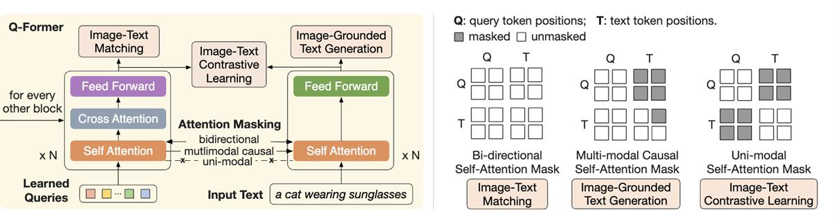 이 사진은 BLIP-2에서 나온 구조도인데, Q-Former 이해에 많은 도움을 준다. 정확히 Instruction과 Image feature가 언제 섞이는지에 대한 정보를 확인할 수 있다. 가장 왼쪽의 Image-Text Matching은 Bi-directional 과정으로, visual feature와 text token의 정보가 공유된다. Image-Grounded Text Generation은 text에 집중하지만, 이미지에 대한 정보도 어느 정도 있는 asymmetric masking을 사용한다. visual feature에 대한 정보가 text로 넘어올 수 있게 설계한 것이다. 마지막으로 Image-Text Contrastive Learning은 text는 text끼리, visual은 visual feature끼리만 self-attention을 진행한다. 이렇게 독립적인 feature를 얻고 contrastive learning을 진행하기 위함이다.