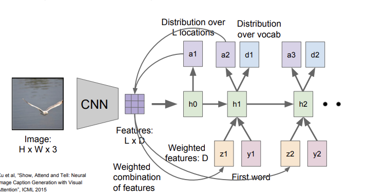 먼저 input image가 들어오면, CNN을 이용해 feature를 뽑는다. 그리고 LSTM을 사용해 attention map과 단어 단위의 generation을 한다. 아래 사진에서 a는 이미지의 어떤 부분에 집중하면 좋을 지 알려주는 attention map을 의미하고, h는 LSTM의 hidden state, d는 단어들의 분포를 의미한다. 또, z는 weighted feature를, y는 word token을 의미한다. 여기서 weighted feature란 의 식을 가지고 계산되는, CNN의 feature 와 attention map 의 weighted sum을 의미한다. 이렇게 계산되는 는 이전에 생성된 단어와 함께 그 다음 hidden state의 input으로 주어지고, hidden state는 attention map과 단어 분포를 생성한다. 이런 식으로 단어 단위의 generation이 이루어지는 것이다.