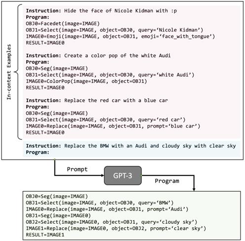 LLM으로는 GPT-3를 사용하는데, 추가적인 학습은 하지 않는다. Instruction과 in-context instruction-program pair를 GPT에 input으로 주고, GPT는 이를 바탕으로 프로그램을 생성한다. 여기서 input image를 condition으로 제공하고, Program interpreter를 통해 결과를 얻는다.